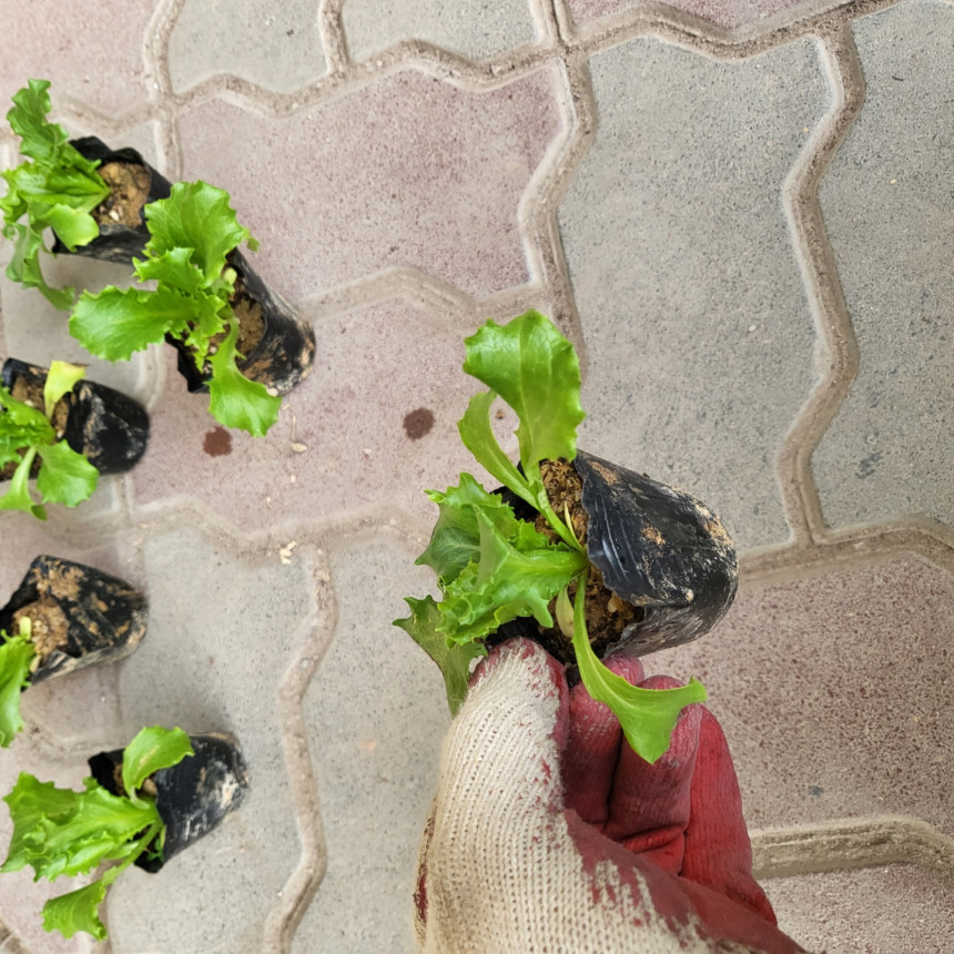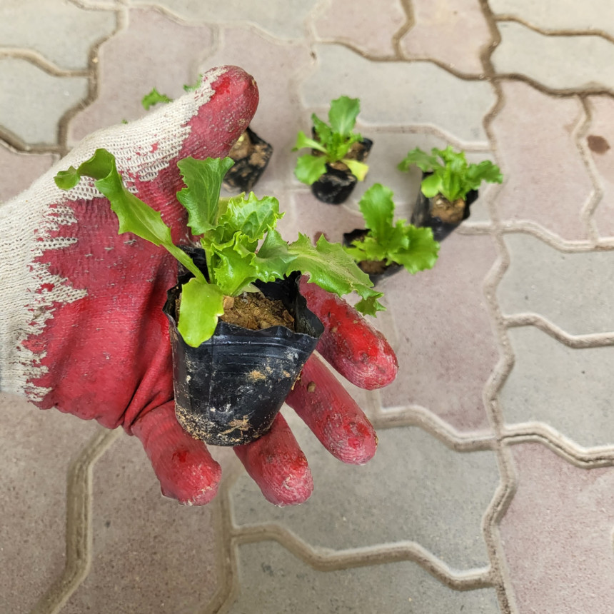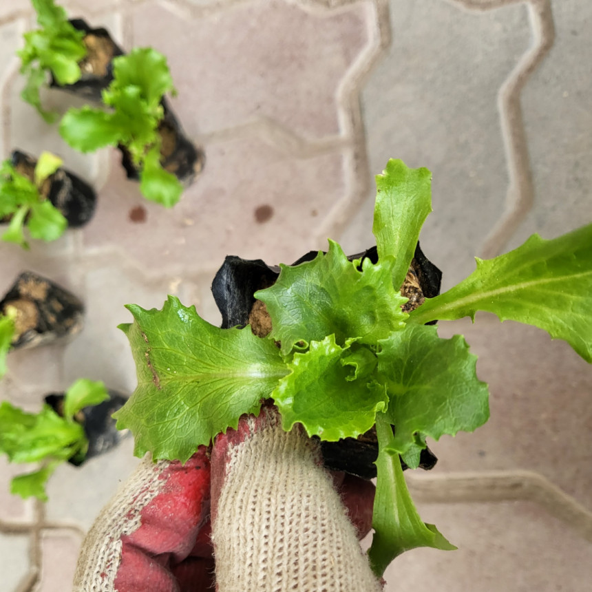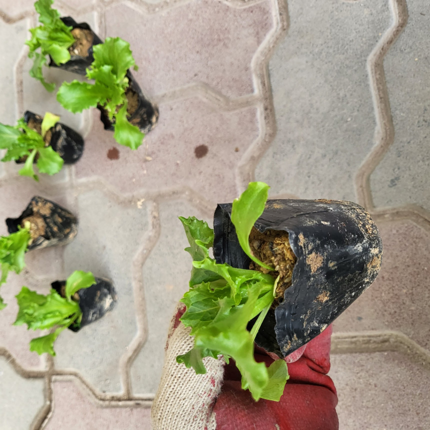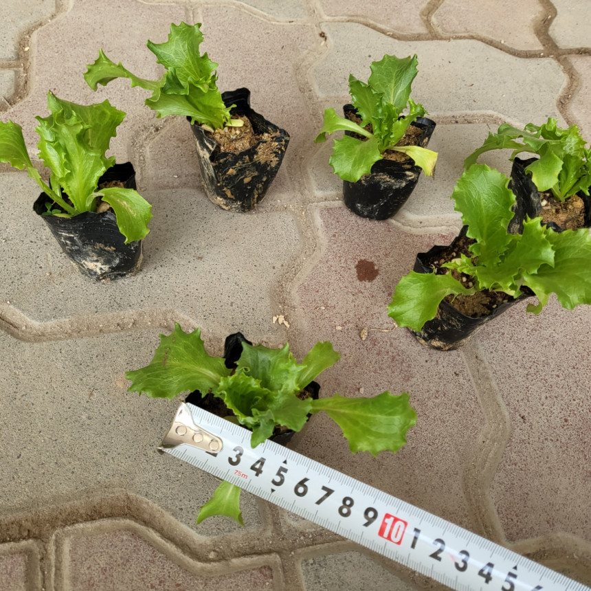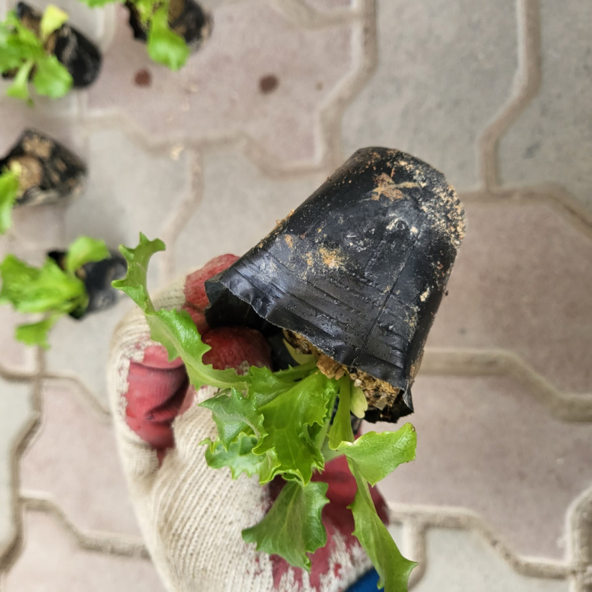 작은 비닐분에 심어진 양상추 모종이에요~